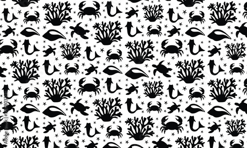 Sea Abstract Underwater Plants Shapes Silhouette Pattern, Coral Reef Plants, Different Types Of Marine Flora Decorative Elements, Abstract Sea Shells, Starfish.