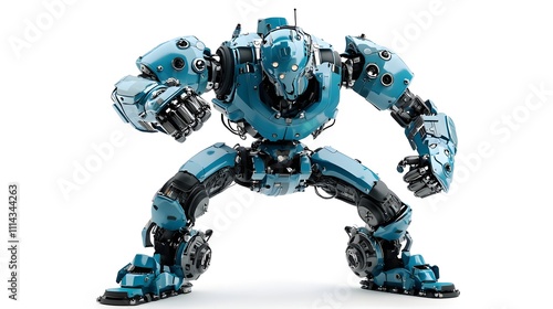 Sea Blue Robot in a Power Stance on a White Background, Asserting Technological Dominance