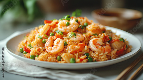Seafood fried rice is mid-toss, with shrimp, scallops, and squid suspended in the air. Steam billows against the black backdrop, and the rice glistens under warm light, adding heat and flavor.