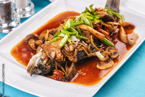 Seafood, Mediterranean cuisine, European dish. Fish stewed in tomato sauce with onion rings, mushrooms, herbs and vegetables. Caucasian national cuisine