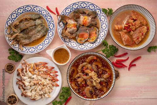 Seafood Sashimi set Fresh shrimp, Mantis shrimps, fresh blue crab, fresh salmon marinated in soy sauce and steamed blue crab, served with spicy seafood dipping sauce.
