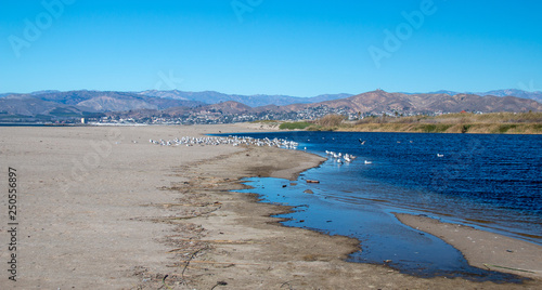Seagulls on narrow isthmus of sand where the Santa Clara river bird preserve meets the beach at Surfers Knoll beach in Ventura California United States