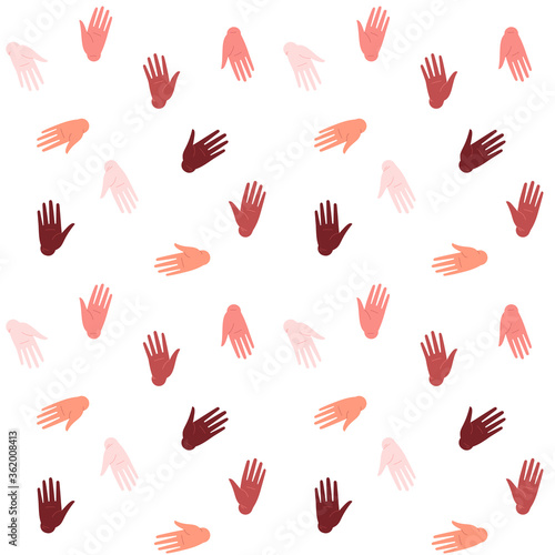Seamles pattern of differently rotated palms of different skin tones on a white background