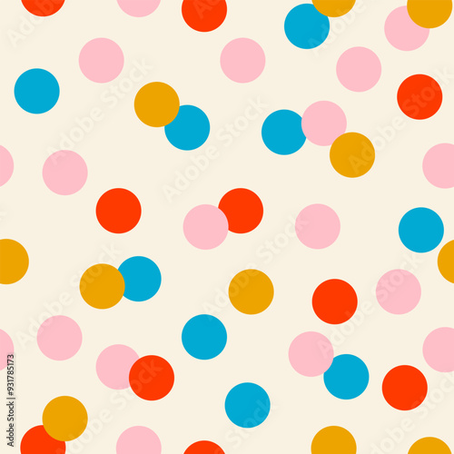 Seamless abstract multicolored polka dot, confetti pattern on a light background, flat style