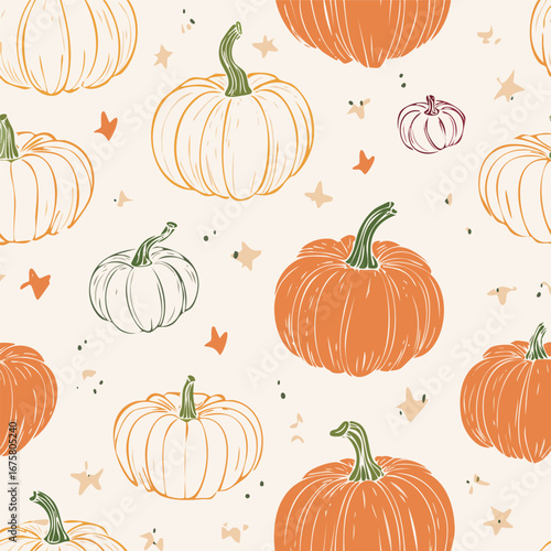 Seamless autumn pattern with orange pumpkins, green leaves, and decorative dots. Cozy seasonal design perfect for fall, Thanksgiving, and harvest themes