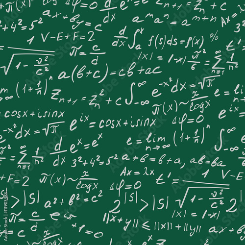 Seamless background on the topic of mathematical theorems, symbols, and formulas, light contour on a green background