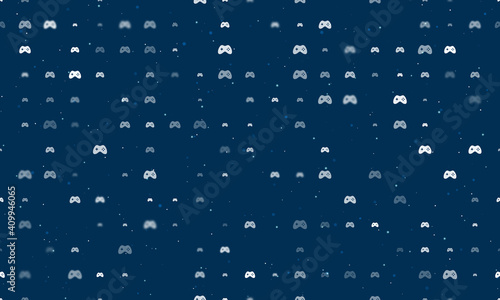 Seamless background pattern of evenly spaced white joystick symbols of different sizes and opacity. Vector illustration on dark blue background with stars