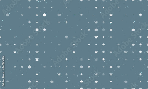 Seamless background pattern of evenly spaced white maple leafs of different sizes and opacity. Vector illustration on blue gray background with stars