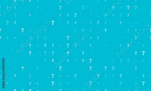 Seamless background pattern of evenly spaced white number seven symbols of different sizes and opacity. Vector illustration on cyan background with stars