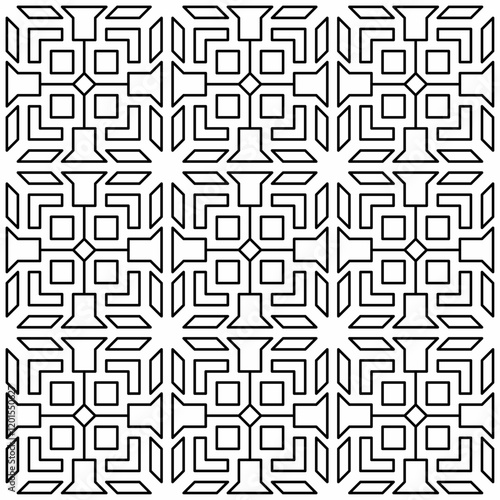 Seamless black and white geometric pattern with symmetrical lines and shapes in a grid layout.
