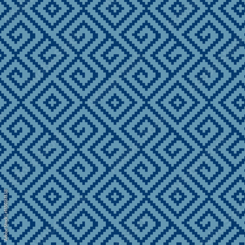 Seamless blue geometric pattern with swirling shapes, diamond motifs, and intricate designs perfect for backgrounds, textiles, wallpapers, and decorative elements.