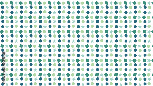Seamless Colorful Geometric Pattern with Stars, Circles, and Hexagons on White