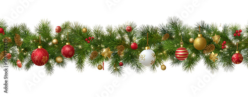 Seamless decorative christmas border with coniferous branches and garlands on transparent background, christmas lights and ornaments festival plant tree.