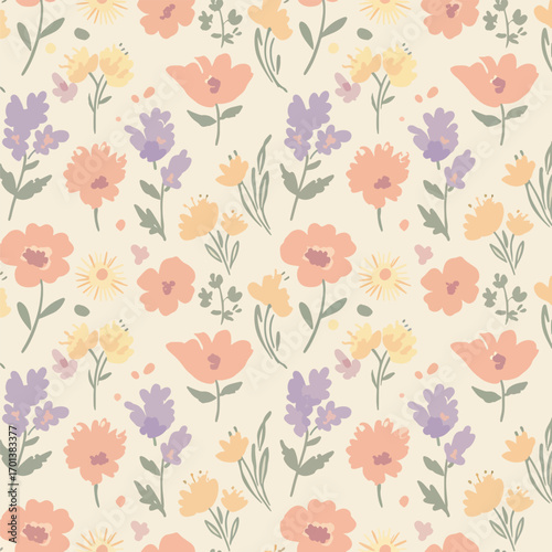 Seamless floral pattern featuring pastel flowers and foliage on a light beige background, seamless pattern, royalty free stock.