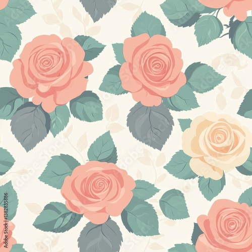 Seamless Floral Pattern Featuring Soft Peach and Yellow Roses with Green Leaves on Light Background