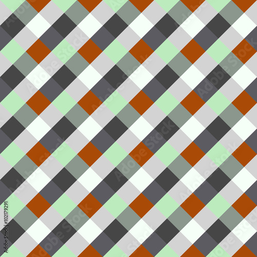 Seamless geometric checked pattern. Diagonal square, woven line background. Rhombus texture. Gray, green, orange colors. Vector
