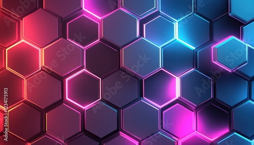 Seamless geometric pattern with hexagons and neon gradients, futuristic and modern aesthetics