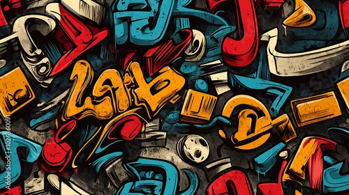 Seamless graffiti pattern incorporating bubble letters, sharp-edged characters, and wildstyle numbers, highlighted with glowing neon colors and dynamic paint splashes,