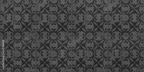 Seamless grunge black anthracite concrete stone cement square mosaic tile mirror texture background, with circle leaf flower motive print