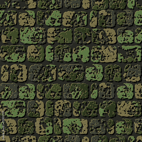 Seamless khaki green camouflage brick stone wall pattern with cracked destroyed old stones. Geometric background for fabric, textile. Grunge style. Not AI