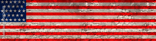 seamless panorama of the national flag of america state on the texture of a rough, old stone wall with cracks, concept historical, tourism, emigration, economy, politics, global world trade