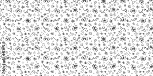 Seamless pattern of floral elements. Monochrome pattern. A pattern of flowers and buds with minimal details. Pattern for textiles, interior and packaging