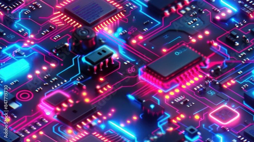 seamless pattern Abstract circuit board with glowing pink and blue lines. High-tech futuristic background. Digital technology concept.