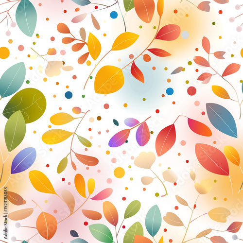 Seamless pattern, colourful leaves and dots, design suitable for fabric, wallpaper, wrapping paper.