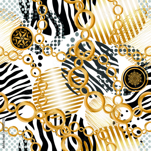 Seamless pattern decorated with precious stones, gold chains and pearls.