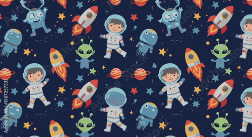 Seamless pattern featuring cute astronauts, aliens, rockets, planets, and stars on a dark blue background, ideal for kids' textile designs and space-themed projects.