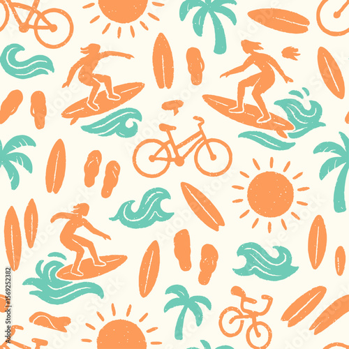 Seamless pattern illustration featuring surfers, surfboards, bicycles, palm trees, waves, sandals, and suns on a light background.