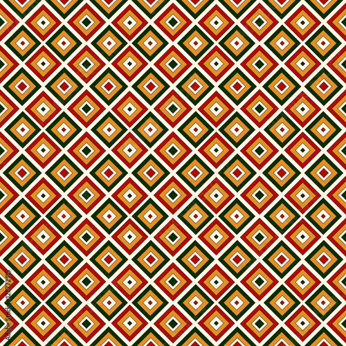 Seamless pattern in Christmas traditional colors. Repeated squares and rhombuses bright ornamental abstract background.
