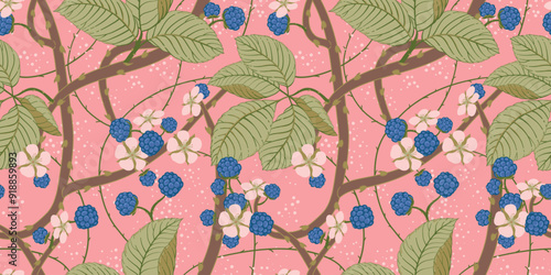 Seamless pattern in the Art Nouveau style for creating textiles, wallpaper, paper. Illustration with intertwined blackberry branches. Berries, leaves and flowers on a soft pink background. Vector.