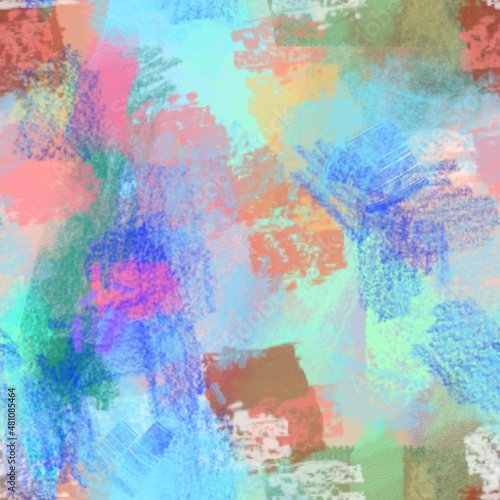 Seamless pattern of abstract elements in light shades of blue, red, yellow and green for textile.