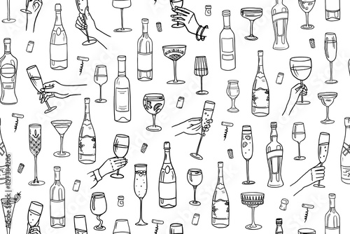 Seamless pattern of alcohol bottles, glasses, hands with glasses in doodle style. Alcohol drinks. Great for bar menu, drink menu, banner, print. Vector illustration EPS10. Isolated on white background