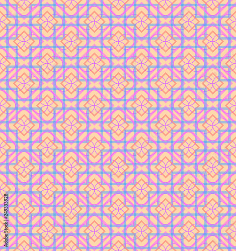 Seamless pattern of colorful abstract geometric shapes with decorative ornament on a yellow background