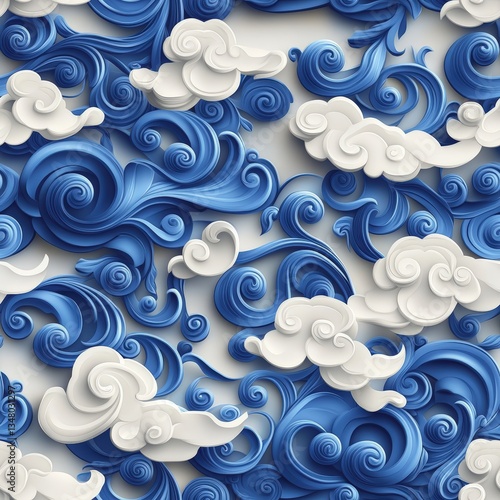 Seamless Pattern of Embossed White Clouds Floating Amongst Swirling Blue Waves in a Stunning Three-Dimensional Design for Creative Projects and Artworks