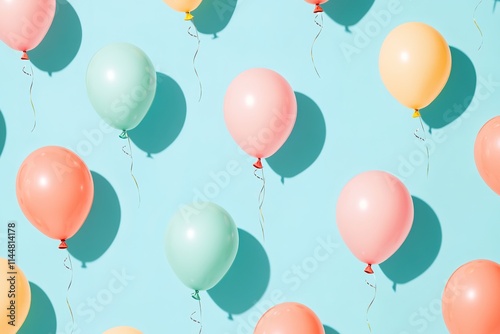 seamless pattern of floating balloons in bright pastel colors on soft sky-blue background