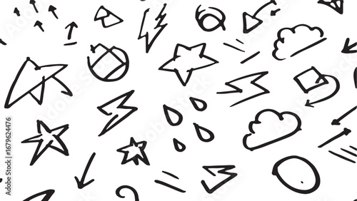 Seamless Pattern of Hand Drawn Doodle Weather Icons and Arrows on White Background Creative Style Vector Illustration