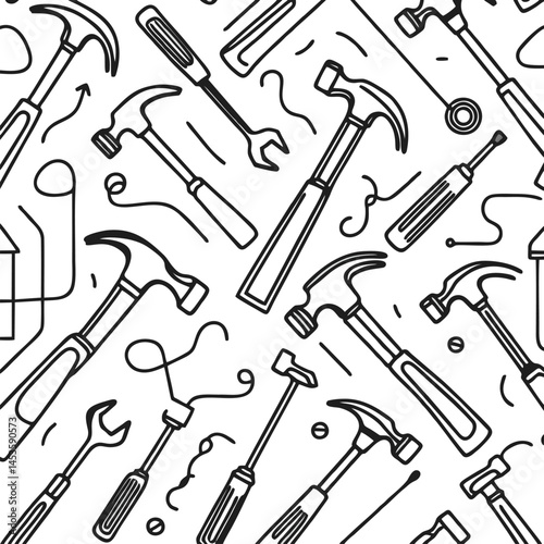 Seamless Pattern of Hand Drawn Tools: Hammers, Screwdrivers, Wrenches