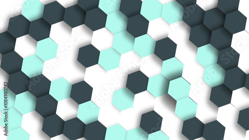 Seamless pattern of interconnected hexagons in various shades of blue and green, Green and White Wallpaper with Geometric Elegance.