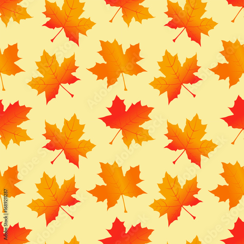 Seamless pattern of orange and red maple leaves on a yellow background, representing the warm and cozy autumn season