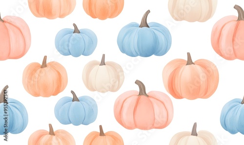Seamless pattern of pumpkins in blue and orange tones on a light background, Generative AI