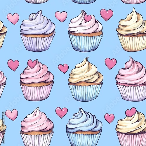 Seamless pattern of small and large cupcakes, with soft pastel colors and delicate shadows