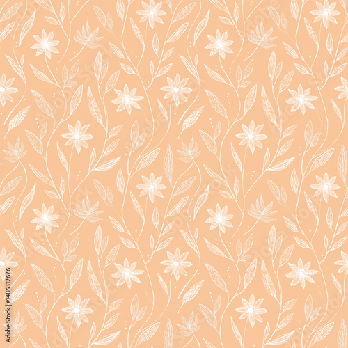 Seamless Pattern Of Stylized Floral Elements In A Light Peach Color Scheme.