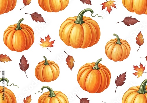Seamless pattern of vibrant orange pumpkins and colorful autumn leaves scattered on a clean white background, perfect for fallthemed designs
