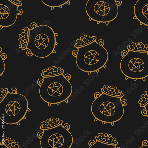 Seamless pattern with boiling magic cauldron. Hand drawn vector illustration.