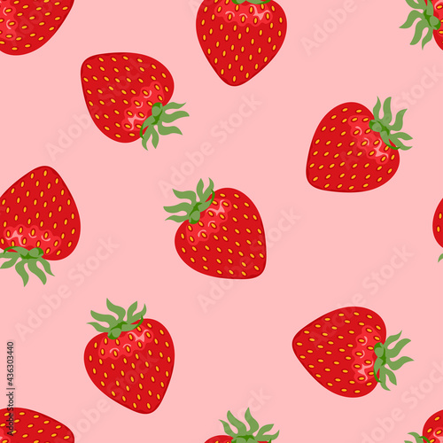 Seamless pattern with cartoon strawberry on red background. Vector flat illustration of fresh berries.
