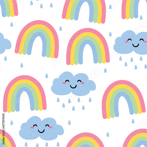 Seamless pattern with clouds, cute cartoon rainbow, for fabric prints, textiles, gift wrapping paper. colorful vector for children, flat style