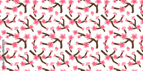 Seamless pattern with cut out stylized blooming sakura branches and flowers. Seasonal Japanese natural background.